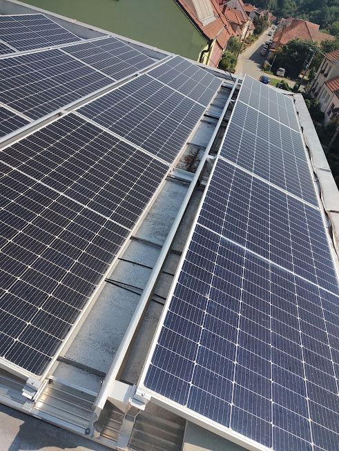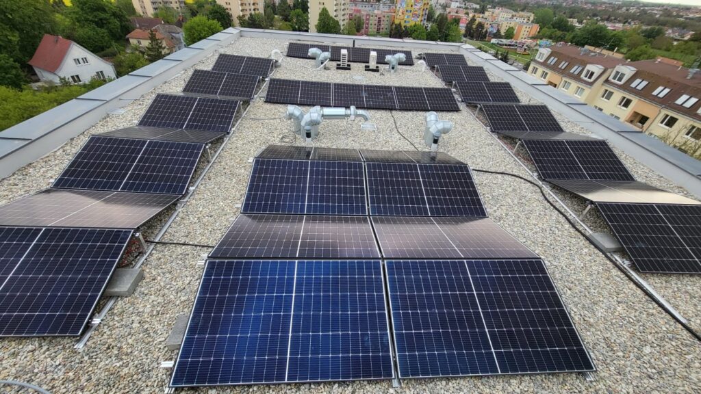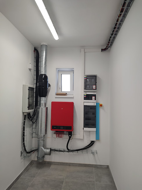 Regulátor přebytků pro fotovoltaický ohřev 40kWp – bytový dům ve Znojmě. Výkon panelů 40Kwp. 4x topné tělěso (2x12Kw, 2x9kw) Objem nádrží 6000L. Na objektu jsou vyplé přetoky. Dodaný řídící systém se stará o buzení měniče Goodwe GW60KS (60kW) a plynulou regulaci výkonu do topných spirál AKU nádrží podle aktuálního osvitu.